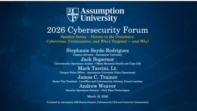 - 1:05:38March 2026 - Presentation 12 - Cybersecurity and Criminology Speaker PanelCybersecurity and Criminology Speaker Panel entitled "Victims in the Crosshairs: Cybercrime, Victimization, and Who's Targeted - and Why!": Stephanie Seyde-Rodriguez (Campus Advocate – Assumption University) Jack Supernor (Cybersecurity Operations Analyst – UMass Memorial Health and Class of '22) Mark Taccini, Lt., (Police Officer – Assumption University) James C. Trainor (Senior Vice President – LevelBlue and Cybersecurity Advisory Council member) Andrew Weaver (Security Operations Director – Park Place Technologies)